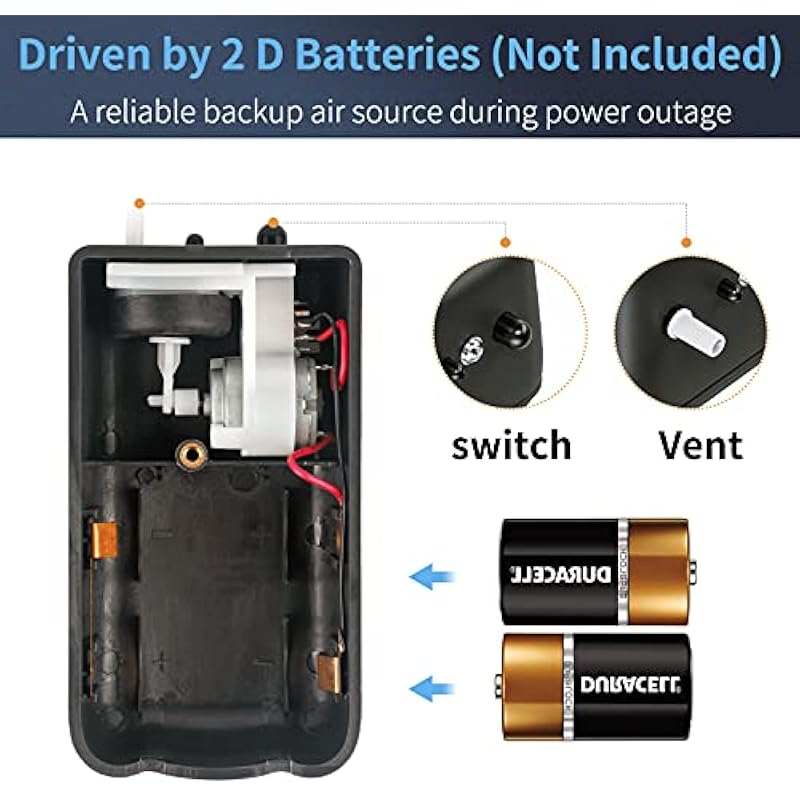 - Battery Operated: Driven by 2 D batteries which last about 40 hours (Not Included). A reliable backup air source in case of emergency such as power outage.